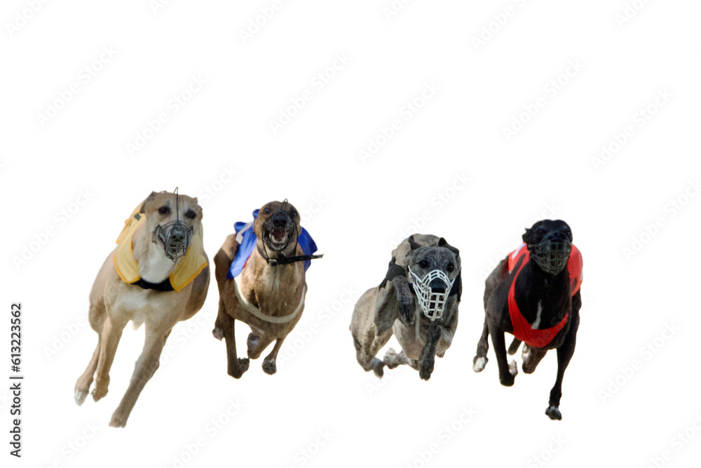 Fotografie Front view of 4 greyhounds of 4 different colors running at full speed on a white background