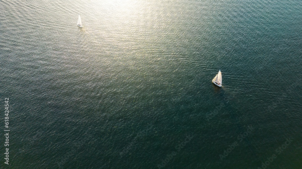 Fotografie Aerial view of sailboats drifting across the serene waters of Lake Norman in Cor