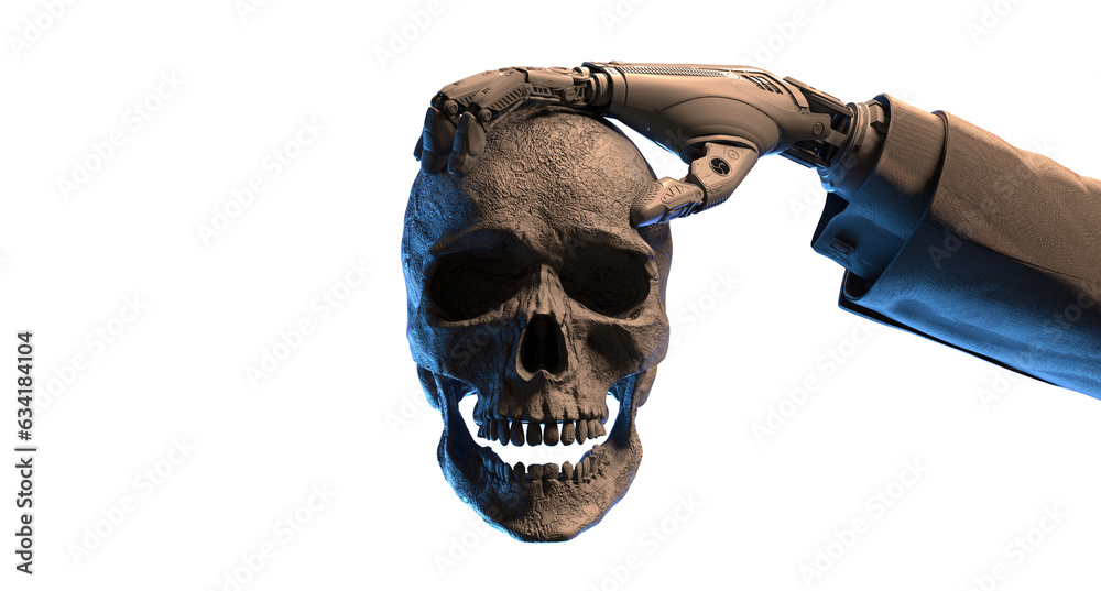 Fotografie Robot against Human, Cybernetic arm in sleeve of business suit holding human skull