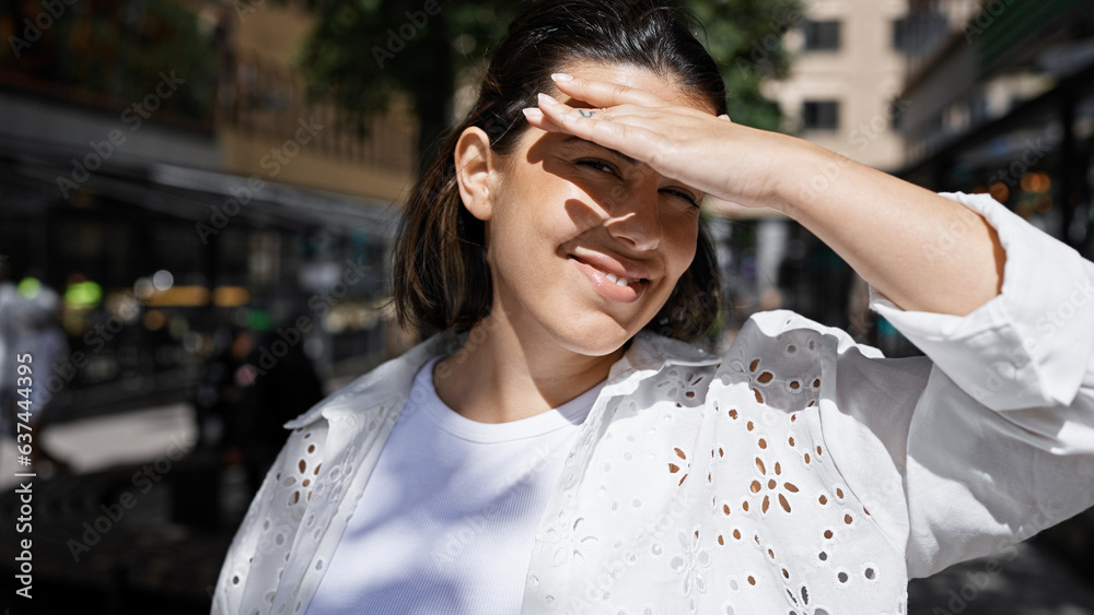 Fotografie Beautiful young hispanic woman covering face and eyes with hand to block sunligh