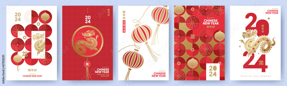 Fotografie Chinese New Year 2024 modern art design set in red, gold and white colors for cover, card, poster, banner