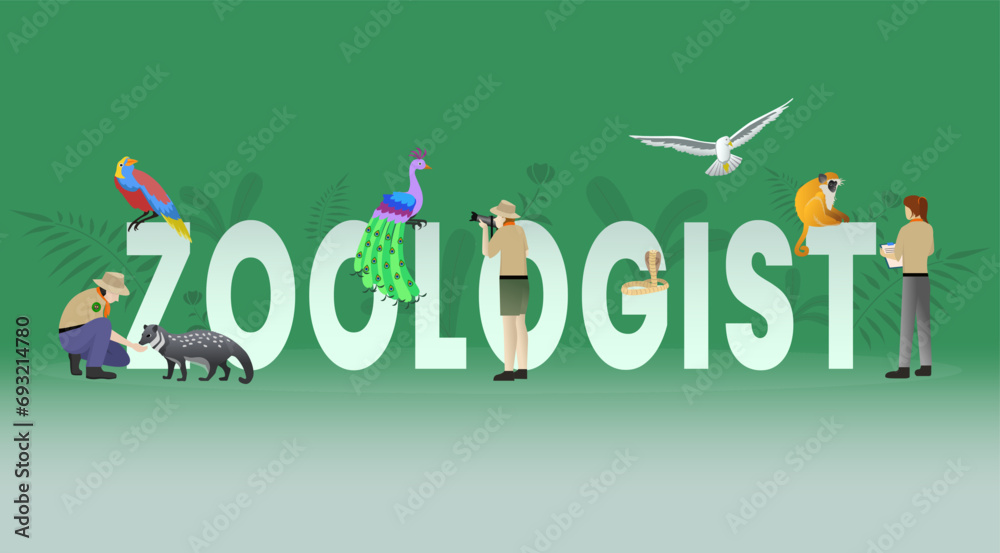 Fotografie zoologist typograph, zoologist word concept vector illustration, animal scientis