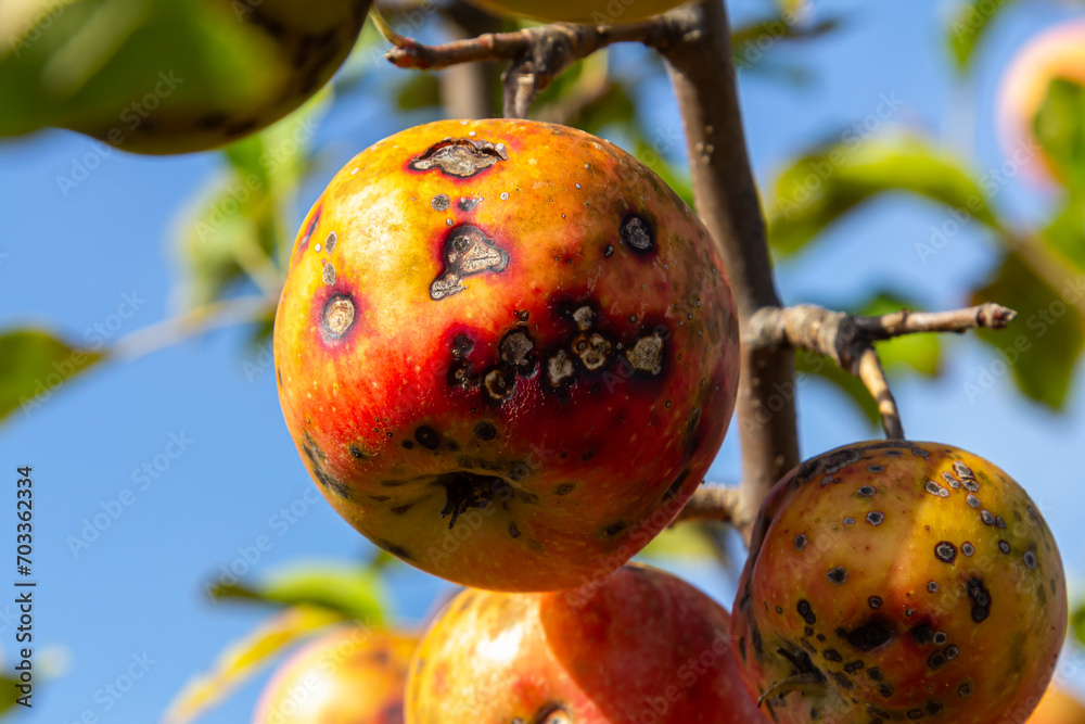 Fotografie a stack of apples with apple scab disease Apple scab, scientifically known as Venturia inaequalis, is a common fungal disease that affects apple trees Malus domestica