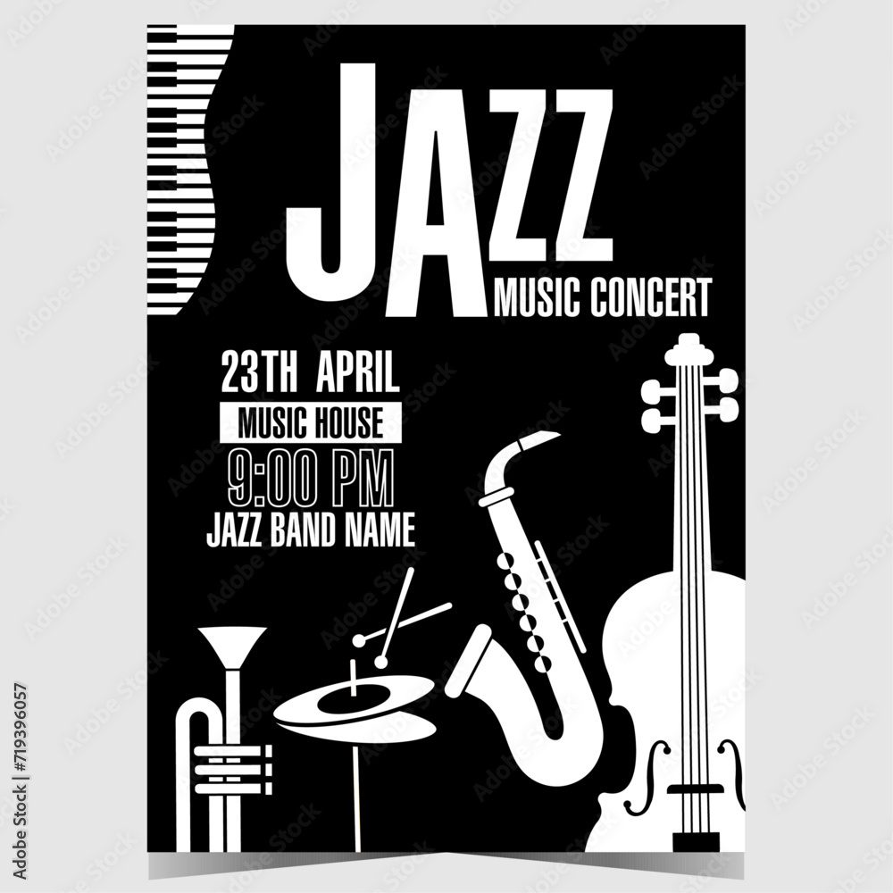Fotografie Jazz music concert poster or banner with musical instruments such as saxophone, trumpet, cello, hi-hat and piano keys in black and white