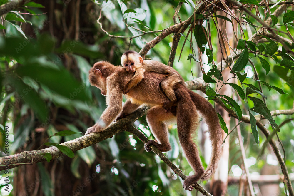 Fotografie photo of monkey thief climbing a tree with baby in amazon rainforest