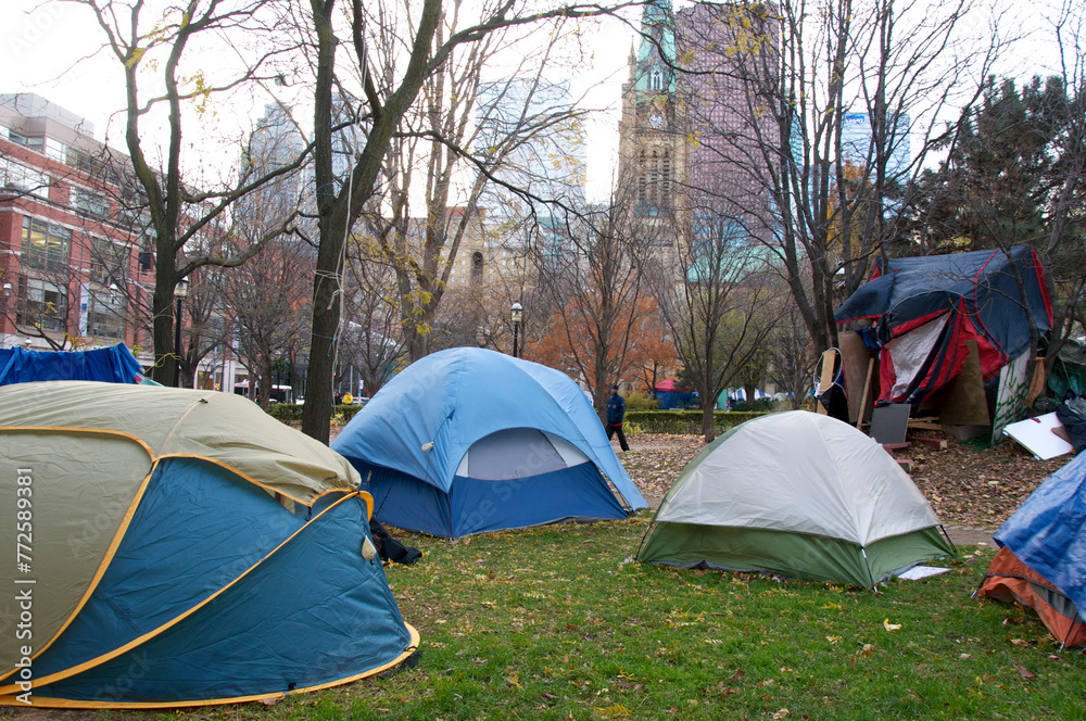 Fotografie Sign in the downtown Toronto parks for the homeless as tent city returns