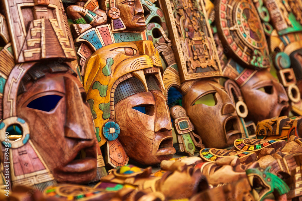 Mayan wooden handcrafted masks in a traditional Mexican market