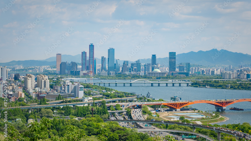 Fotografie A view of Seoul with the Han River and several high-rise buildings