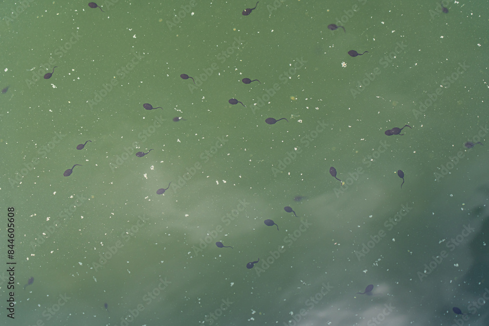 Fotografie lots of frogs and Pollen in a green lake, background with green water and tadpol