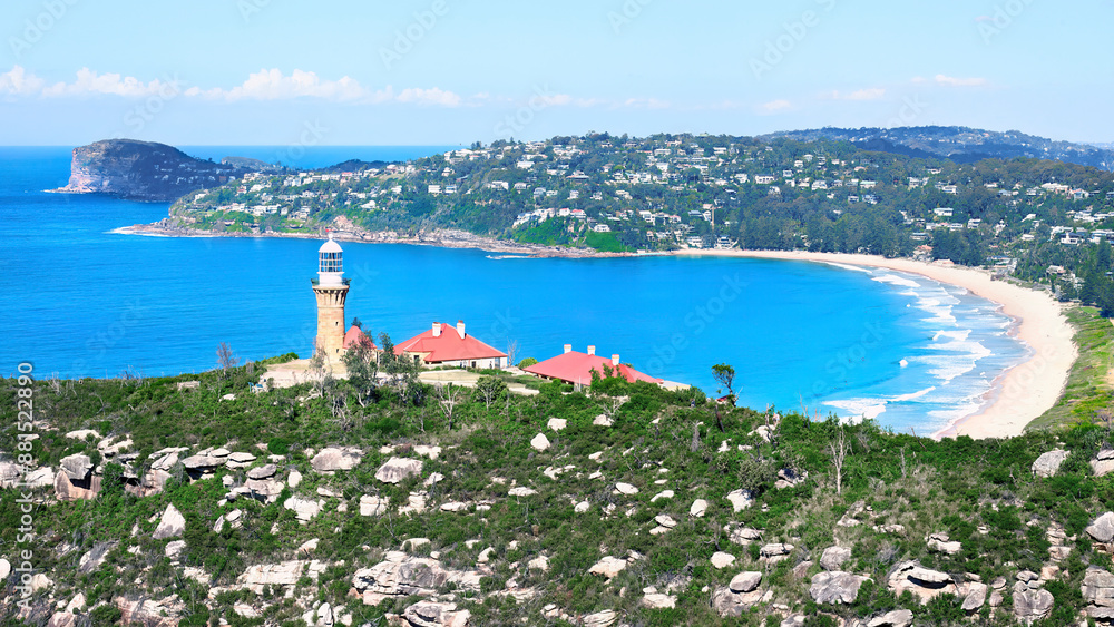 Fotografie Barrenjoey Lighthouse into Palm Beach from Helicopter