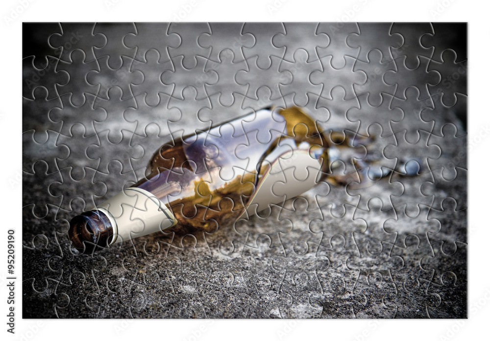 Fotografie Puzzle of a broken bottle of beer resting on the ground - concept image