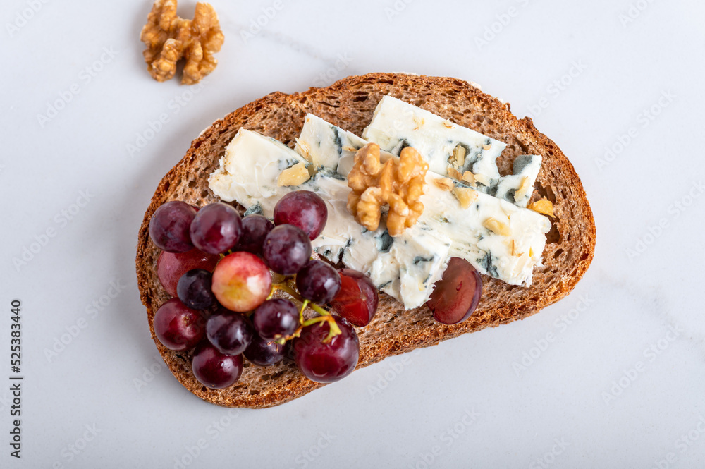 Fotografie Toasted bread with mild creamy blue cheese, grapes and walnuts on grey backgroun