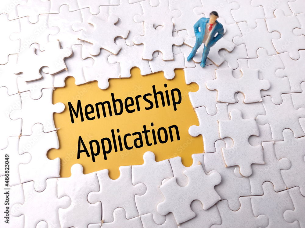 Fotografie Top view miniature people with text Membership Application on a white puzzle background