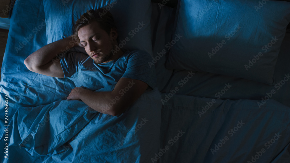 Fotografie Top View of Handsome Young Man Sleeping Cozily on a Bed in His Bedroom at Night