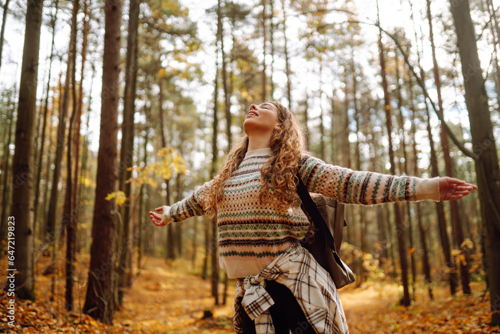 Fotografie Tourist with a hiking backpack, hat walks along a path in the autumn forest