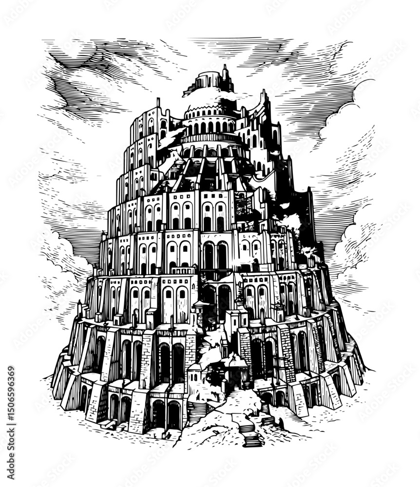 Fotografie tower of babel biblical scene – hand drawn religious vector