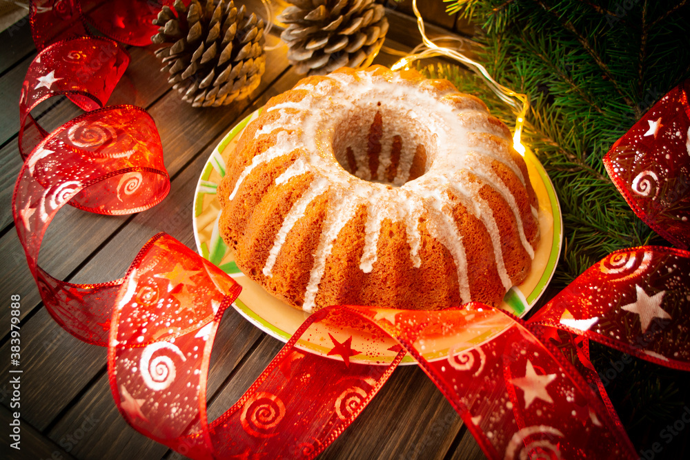 Fotografie Traditional homemade christmas cake holiday dessert in new year tree decorations frame on vintage wooden table background