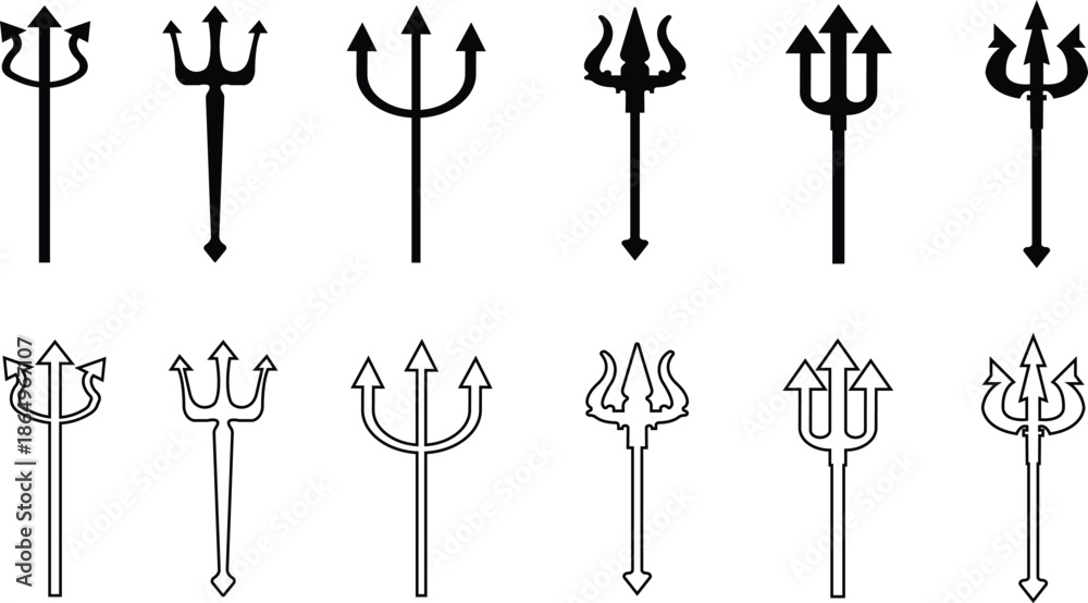 Fotografie Trident Flat Line Style Vector Icon Set, Mythology Weapon Symbol Collection and