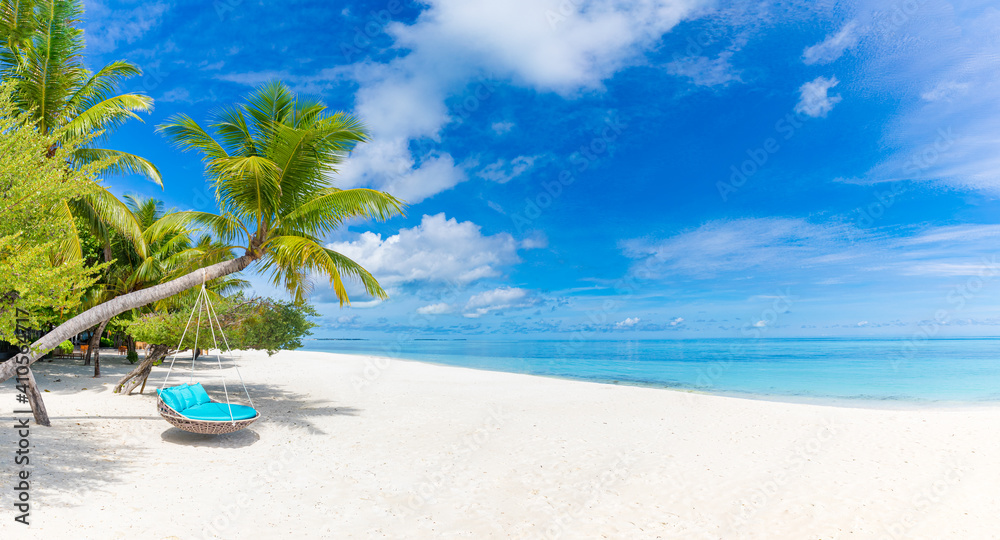 Fotografie Tropical beach background as summer relax landscape with beach swing or hammock and white sand and calm sea for beach template