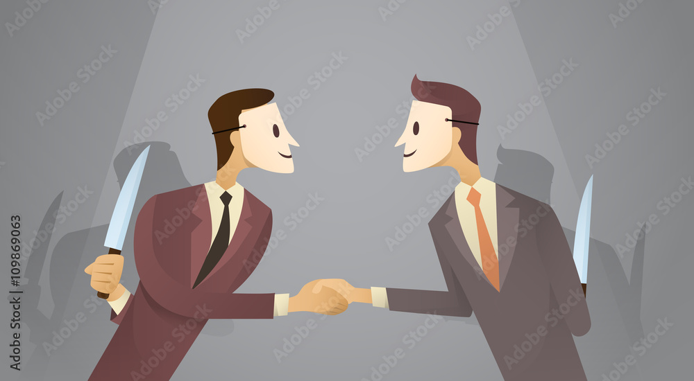 Fotografie Two Business Man In Mask Shake Hands Hold Knife, Danger Betray Agreement Concept