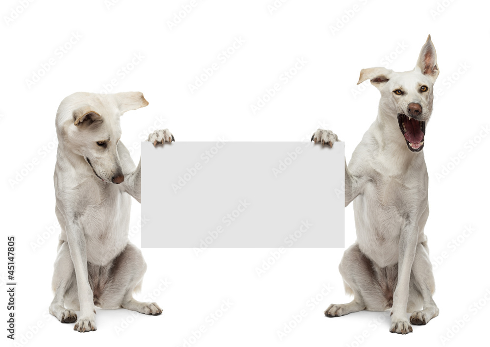 Fotografie Two Crossbreed dogs sitting and holding white sign against white