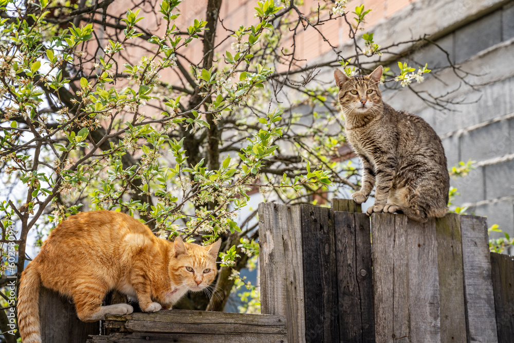 Fotografie Two cute beautiful cats gray and red are sitting on a fence in a rural area