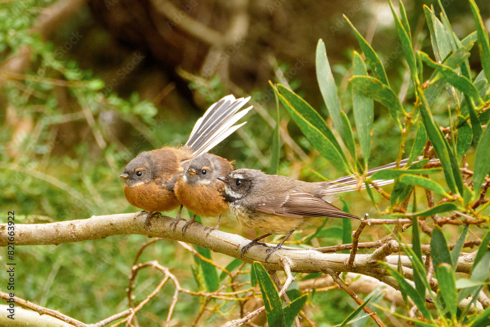 Obraz na plátně Two fledgling fantails and an adult fantail (rhipidura fuliginosa) perched together on a branch