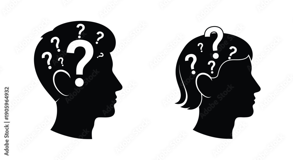Fotografie Two heads filled with question marks a thoughtful black silhouette