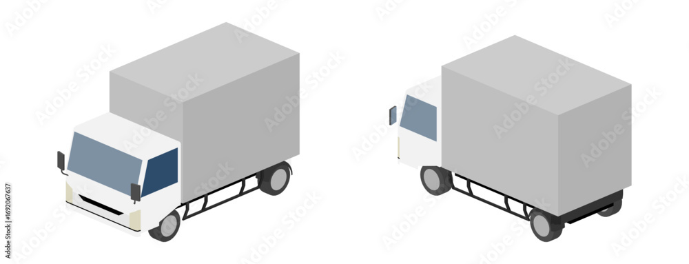 Fotografie Two isometric box trucks, white cabs, gray cargo containers, black chassis, blac
