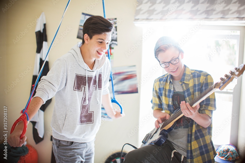 Fotografie Two teenage boys having fun and playing electric guitar in room
