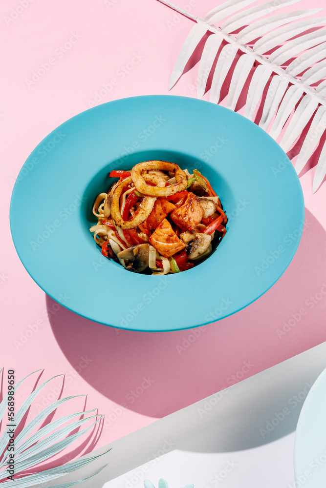 Fotografie Udon with calamary and vegetables, seafood on blue pastel color plate at white b