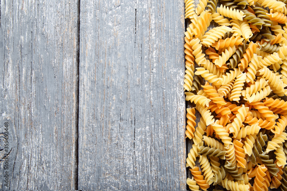 Fotografie Uncooked pasta on grey wooden table