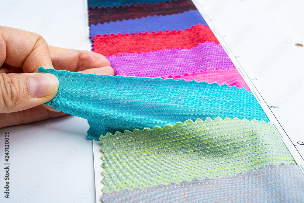 Fotografie Underwear sportswear swimming trunks stretch fabric color card / hand stretch fa
