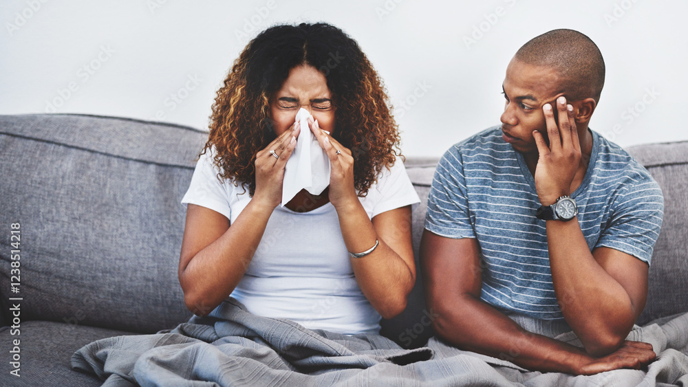 Fotografie Upset, couple and sick woman in home with blowing nose, allergy or toxic partner annoyed by allergies