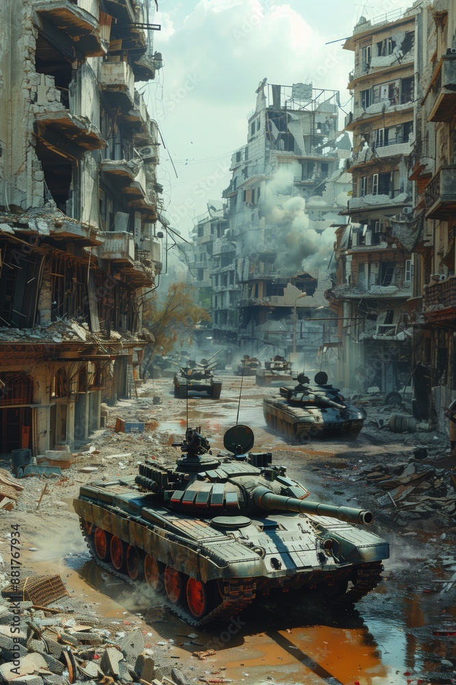 Fotografie Urban Warfare: Tanks navigating through a war-torn city with buildings in ruins, firing at targets and advancing through debris-filled streets