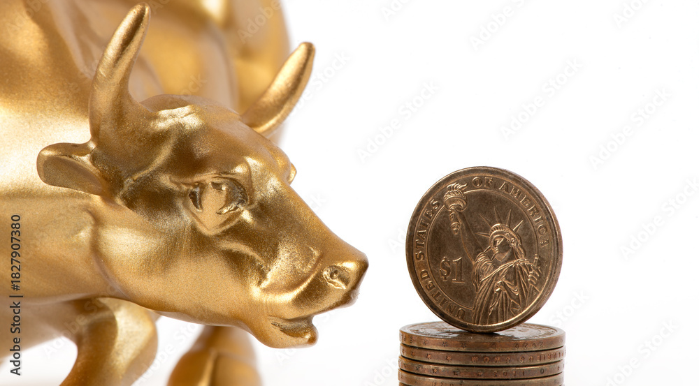 Fotografie US $1 coin and a golden bull on a white background