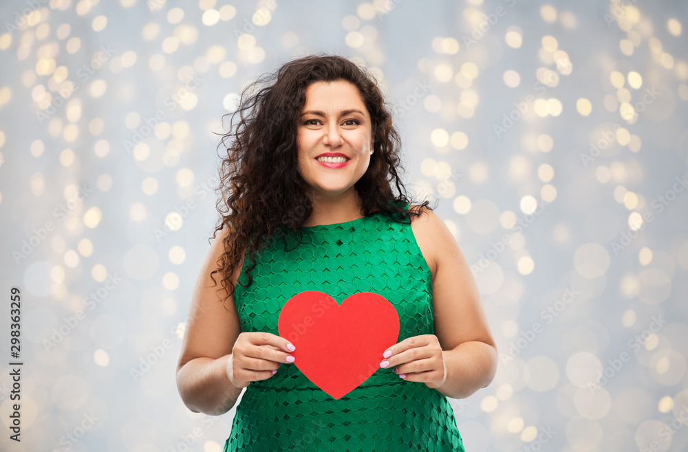 Fotografie valentine's day, holidays and love concept - happy woman in green dress holding