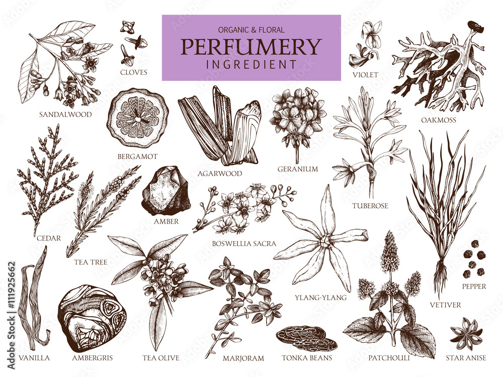 Fotografie Vector collection of hand drawn perfumery materials and ingredients