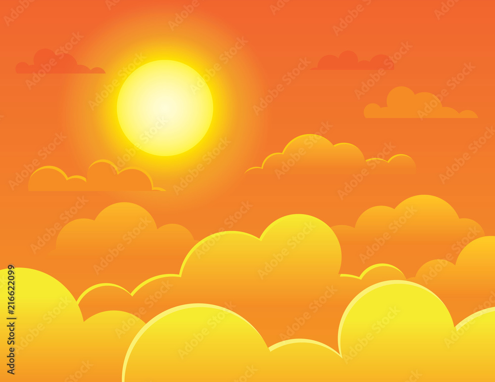 Fotografie Vector colorful illustration of a bright full sun on a background of a orange sky