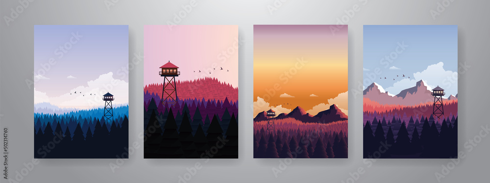 Fotografie Vector forest landscape colorful poster, with firewatch tower