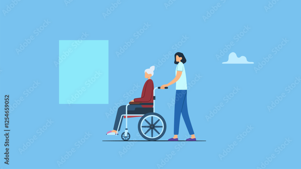 Fotografie Vector illustration a nurse or caregiver pushing adult woman, senior, elderly on wheelchair at a nursing home
