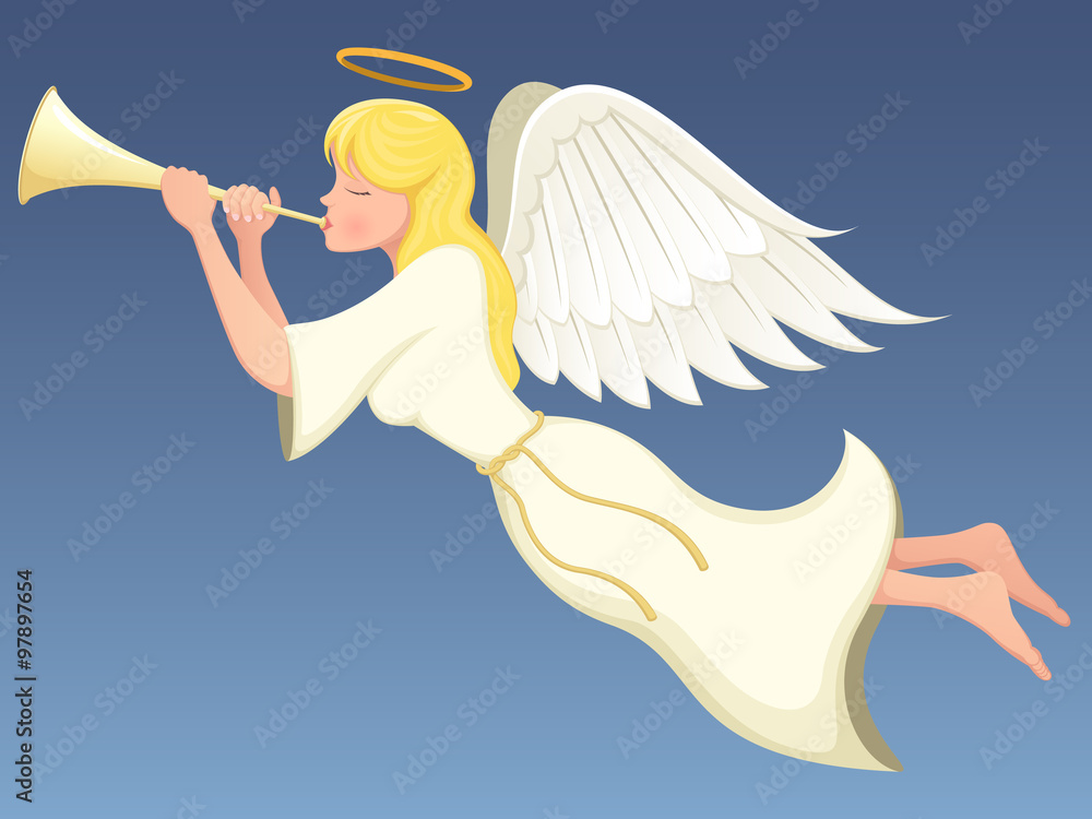 Obraz na plátně Vector illustration of a winged angel flying and playing a brass horn