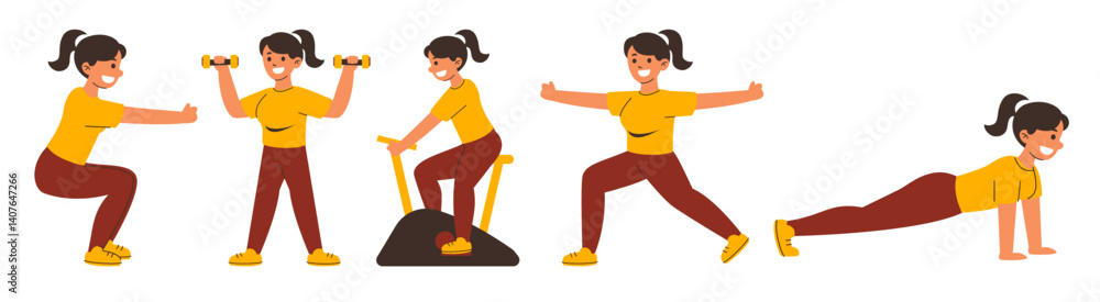 Fotografie Vector illustration of a woman doing exercise at the gym in flat style, she does various type of exercise
