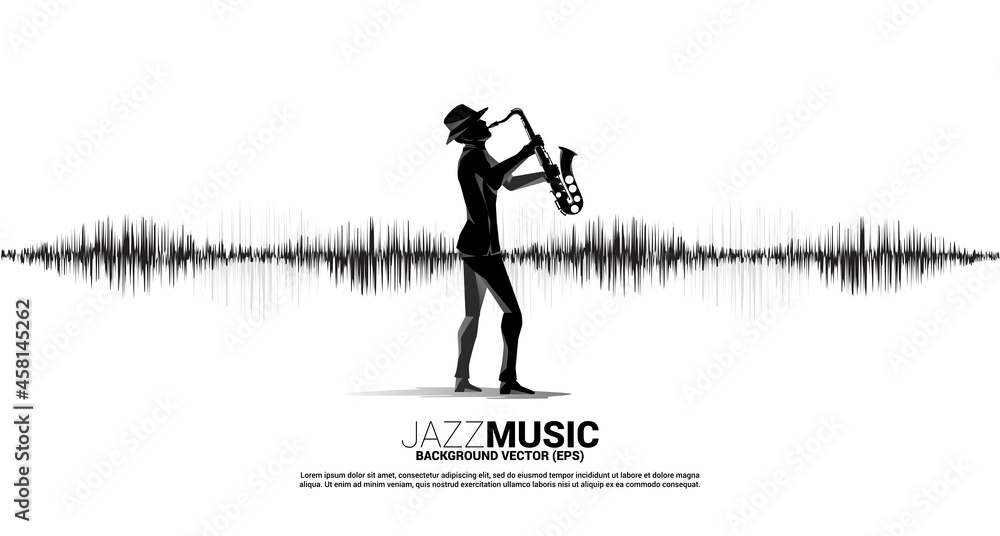 Obraz na plátně Vector silhouette of the saxophonist with music note icon Sound wave Equalizer background