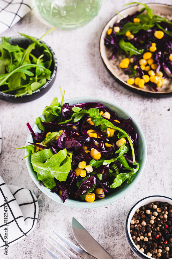 Fotografie Vegetarian salad of purple cabbage, corn and arugula in a bowl on the table vert