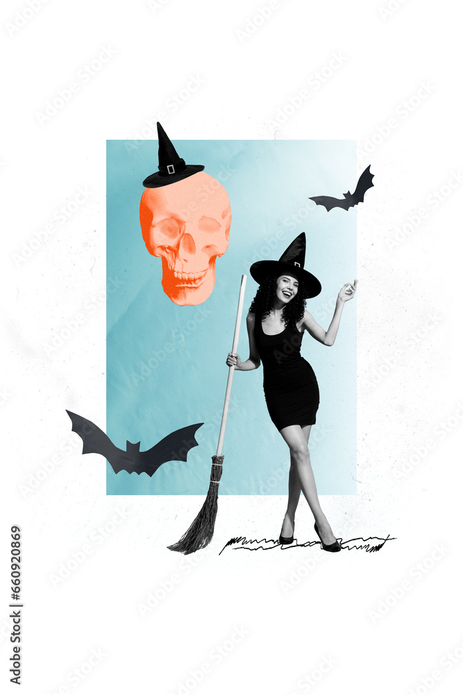 Fotografie Vertical composite creative photo collage of happy witch hold broomstick prepare