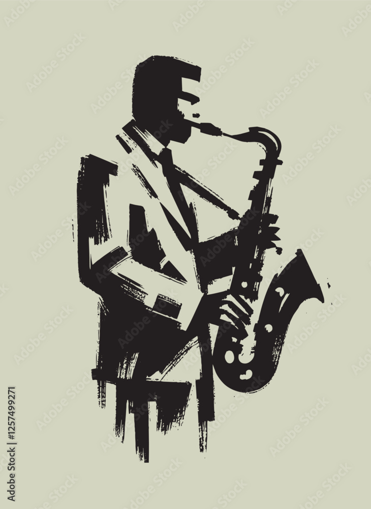 Fotografie Vertical minimalist black and white saxophone player brush poster