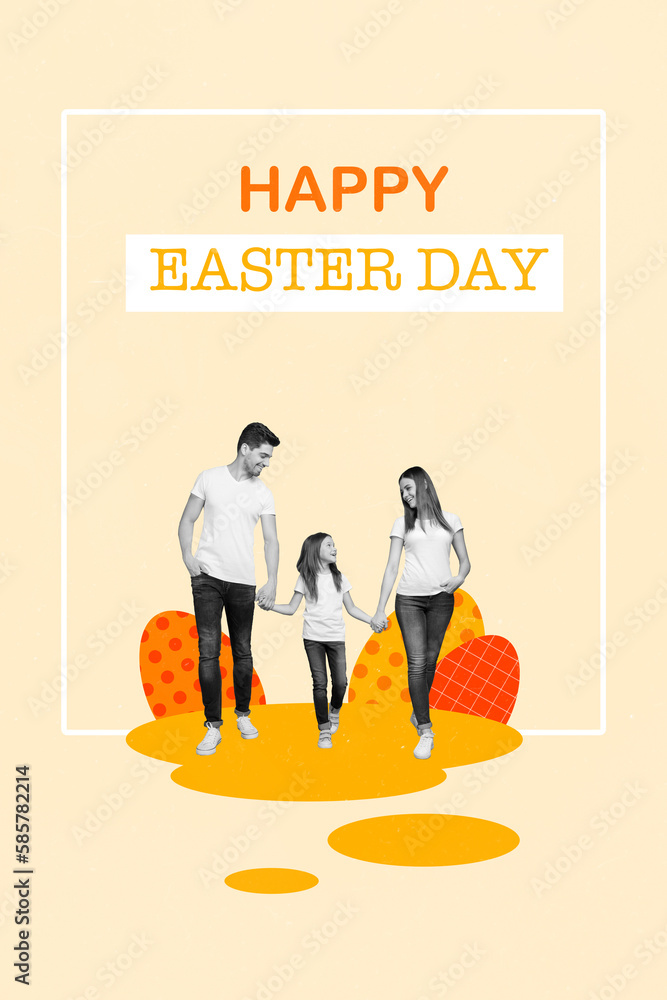 Fotografie Vertical photo collage young family mommy daddy hold her daughter hand spend Eas