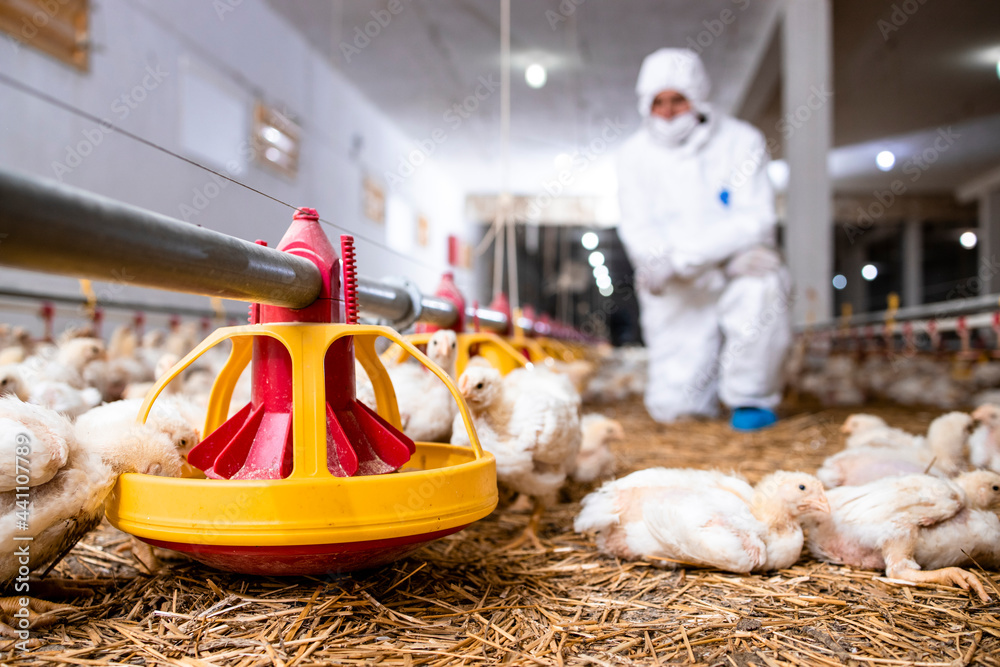 Fotografie Veterinarian in sterile clothing controlling chicken health at modern poultry farm
