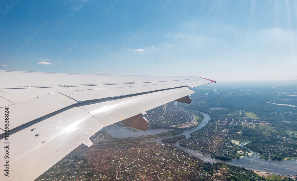 Fotografie View from the airplane window during takeoff at Sheremetyevo airport at summer